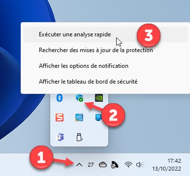 Pour lancer une analyse rapide de l’ordinateur, il n’est plus nécessaire d’ouvrir l’application Sécurité Windows : cliquez sur Afficher les icônes cachées (1) dans la partie droite de la barre des tâches, cliquez du bouton droit sur l’icône du centre de sécurité (2) et sélectionnez Exécuter une analyse rapide (3) dans le menu contextuel: