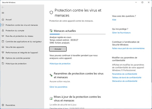 La fenêtre Sécurité Windows s’affiche et une analyse rapide est lancée :