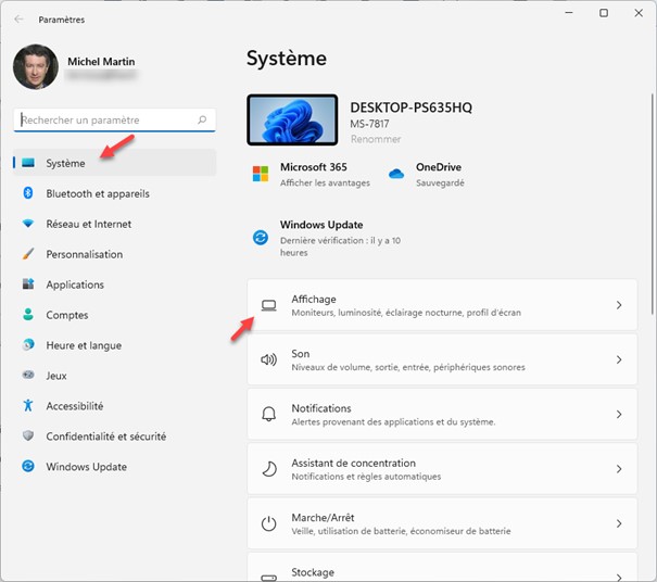 Si plusieurs écrans sont reliés à votre ordinateur, il est important de choisir l’écran par défaut. En effet, c’est sur cet écran que s’ouvrent par défaut les fenêtres des applications. Appuyez simultanément sur les touches Windows et I pour ouvrir la fenêtre des paramètres. L’onglet Système est sélectionné par défaut. Cliquez sur Affichage dans la partie droite de la fenêtre :