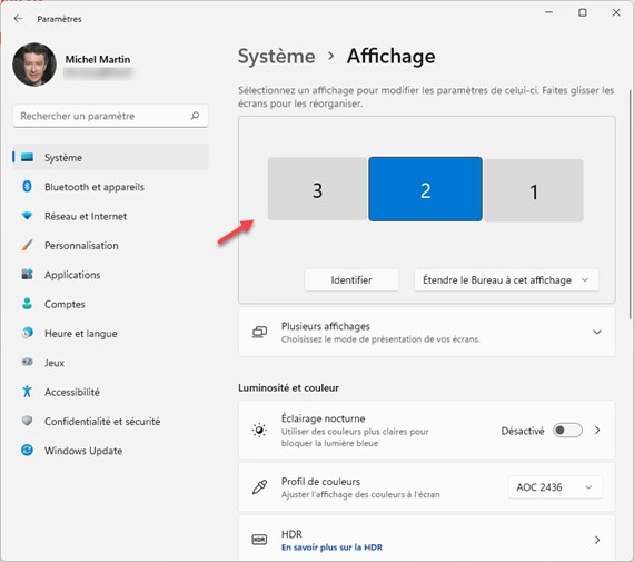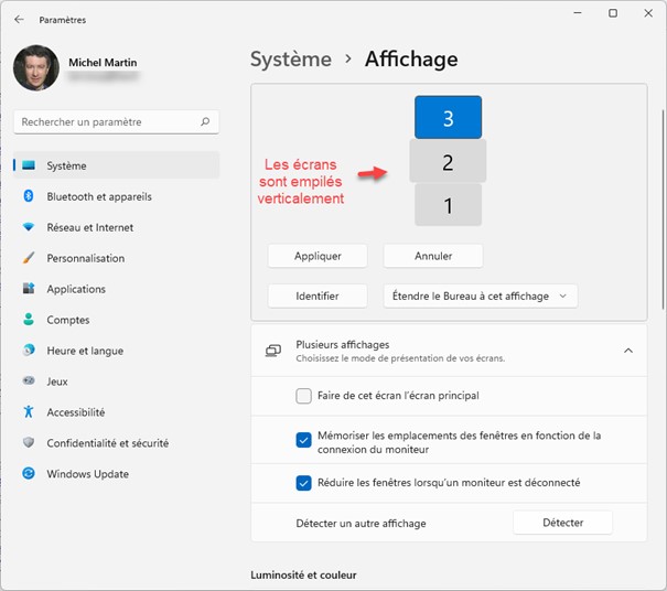 La fenêtre Système/Affichage s’affiche. Ici, trois écrans sont connectés à l’ordinateur :