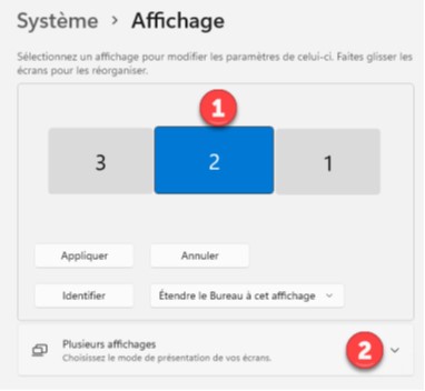Pour choisir l’écran principal, cliquez dessus dans la partie supérieure de la fenêtre (1). Sa vignette apparaît alors en bleu. Développez ensuite la section Plusieurs affichages en cliquant dessus (2) :