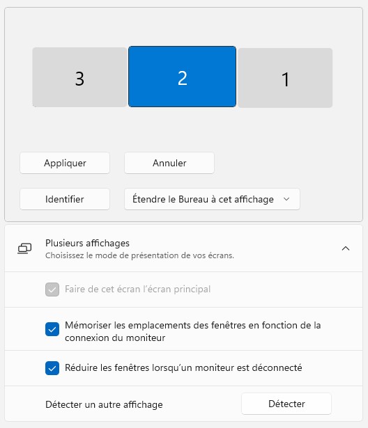 Si la case Faire de cet écran l’écran principal est grisée, cela signifie que l’écran sélectionné est déjà l’écran principal. Dans le cas contraire, cochez cette case pour qu’il devienne l’écran principal. Ici, l’écran 2 est l’écran principal :