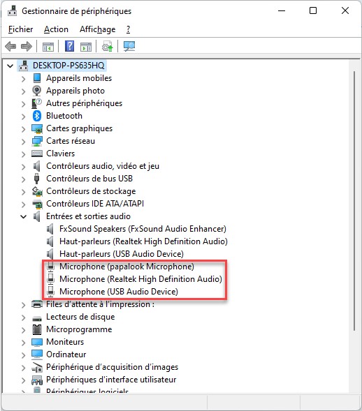 Connectez un microphone (ou une webcam) à votre ordinateur et assurez-vous qu’il (elle) est bien reconnu(e). Pour cela, appuyez puis relâchez la touche Windows, puis tapez gestionnaire. L’entrée Gestionnaire de périphériques est en surbrillance sous Meilleur résultat. Appuyez sur la touche Entrée pour exécuter cette application. Vérifiez que votre micro est bien reconnu en développant la section Entrées et sorties audio :