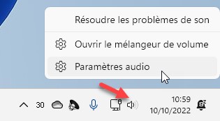 Si nécessaire, vous pouvez régler le niveau d’entrée d’un micro. Pour cela, cliquez du bouton droit sur l’icône qui représente un haut-parleur dans la partie droite de la barre des tâches et choisissez Paramètres audio dans le menu contextuel :