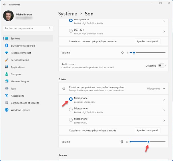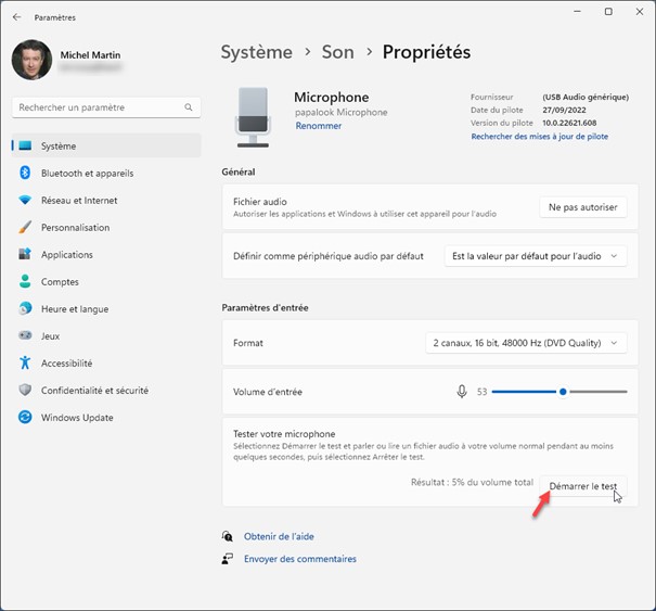 Pour tester le réglage du niveau d’entrée, cliquez sur le signe « > » à droite du microphone concerné sous Entrée. La fenêtre Système/Son/Propriétés s’affiche. Cliquez sur Démarrer le test et parlez. Ajustez la distance du microphone ou le curseur Volume d’entrée pour obtenir un niveau d’entrée compris entre 50 et 90 pour cent du volume total :