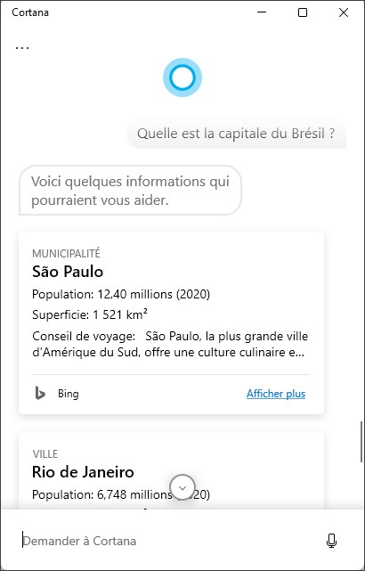 Maintenant que votre microphone est réglé, vous pouvez formuler vos requêtes en parlant. Cliquez sur l’icône du microphone, à droite de la zone de saisie Demander à Cortana et posez votre question :
