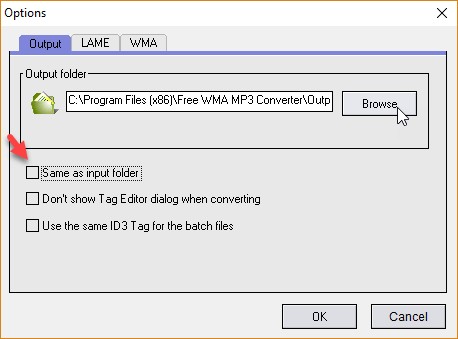 Dans un premier temps, cliquez sur Settings, sous Options. La boîte de dialogue Options s’affiche. Par défaut, les sons convertis sont stockés dans le même dossier que les sons originaux. Si vous préférez les stocker dans un dossier spécifique, décochez la case Same as input folder et désignez le dossier de sauvegarde en cliquant sur Browse :