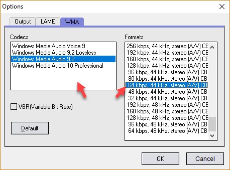 Si vous envisagez de faire des conversions au format WMA, basculez sur l’onglet WMA et choisissez un codec et un format. Faites quelques essais pour trouver le meilleur compromis qualité/poids :