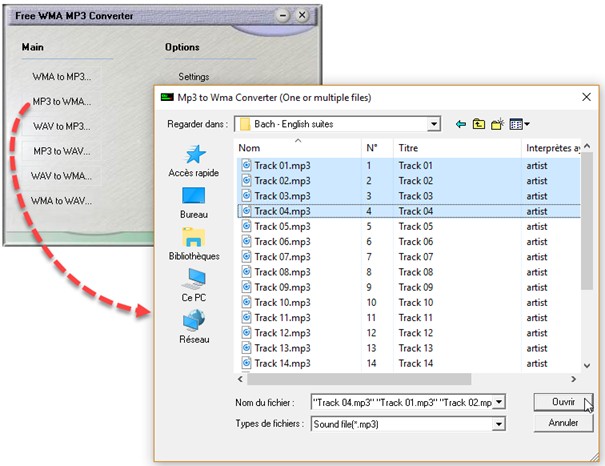 Il ne vous reste plus qu’à cliquer sur une des entrées sous Main pour faire vos conversions. Désignez le ou les fichiers à convertir, cliquez sur Ouvrir et patientez jusqu’à la fin de la conversion :