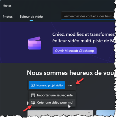 Cliquez sur les points de suspension, à droite de Nouveau projet vidéo, puis sur Créer une vidéo pour moi :