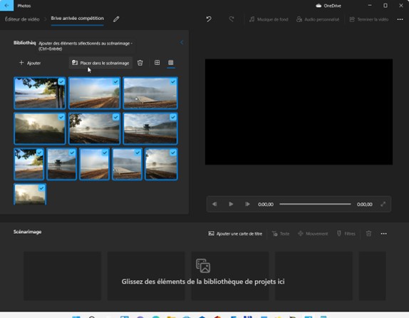 Les photos apparaissent sélectionnées dans la bibliothèque de projets. Cliquez sur Placer dans le scénarimage pour les ajouter dans le scénarimage (la timeline) :