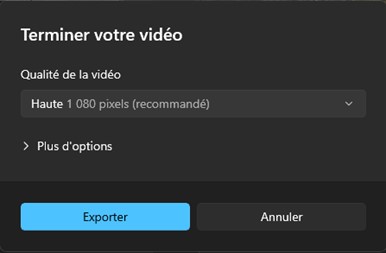 Pour convertir le projet vidéo en une vidéo au format MP4, cliquez sur Terminer la vidéo. Choisissez une qualité vidéo, puis cliquez sur Exporter :