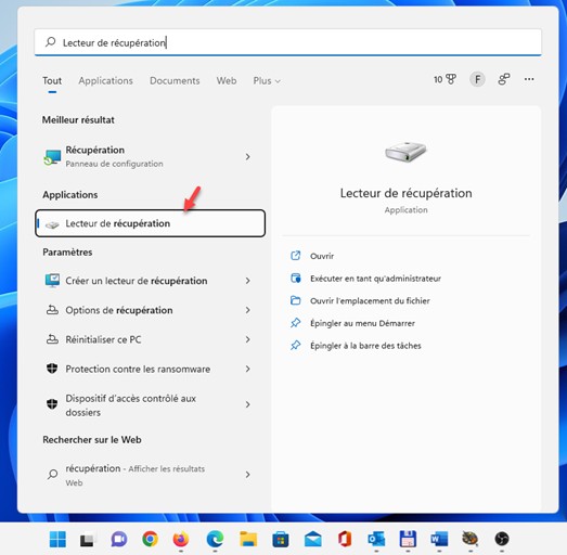 Je suis sûr que dans votre entourage, vous avez un autre ordinateur qui fonctionne sous Windows 11. Dans ce cas, mettez cet ordinateur sous tension, appuyez puis relâchez la touche Windows du clavier, puis tapez lecteur. Utilisez les touches fléchées pour mettre l’entrée Lecteur de récupération en surbrillance dans le menu Démarrer, puis appuyez sur la touche Entrée :