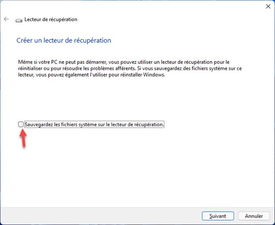 Une boîte de dialogue s’affiche. Décochez la case Sauvegardez les fichiers système sur le lecteur de récupération :