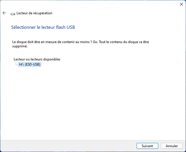 Munissez-vous d’une clé USB d’au minimum 4 Go et connectez-la à l’ordinateur. Attention, toutes les données de la clé seront effacées. Assurez-vous d’en faire une sauvegarde si la clé n’est pas vierge. Cliquez sur Suivant. Au bout de quelques secondes, une boîte de dialogue indique quels supports amovibles sont connectés sur votre ordinateur :