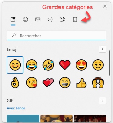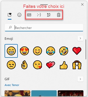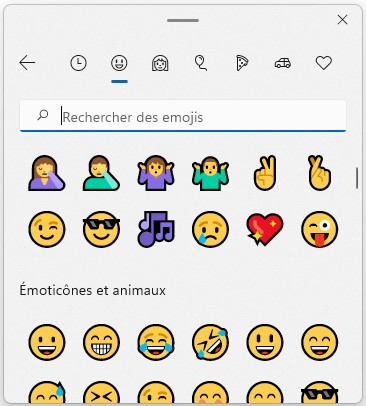 Basculez sur l’application dans laquelle vous voulez insérer un émoticône, puis appuyez simultanément sur les touches Windows et . du clavier. Une boîte de dialogue s’affiche en avant-plan :
