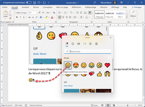 Lorsque vous cliquez sur un émoticône, il est inséré dans l’application qui avait le focus. Ici, dans une fenêtre Word 2021 :