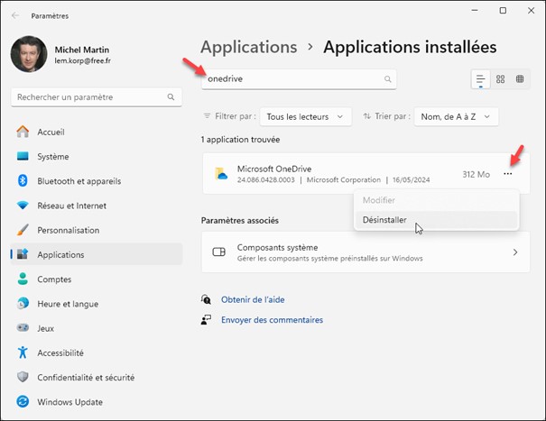 Pour désinstaller OneDrive, appuyez puis relâchez la touche Windows, puis tapez désinstaller. L’entrée Ajouter ou supprimer des programmes est en surbrillance dans la partie supérieure du menu Démarrer. Appuyez sur la touche Entrée pour ouvrir la fenêtre Applications/Applications installées. Tapez onedrive dans la zone de texte supérieure pour filtrer l’affichage. Cliquez sur les points de suspension, en face de Microsoft OneDrive, puis sur Désinstaller dans le menu :