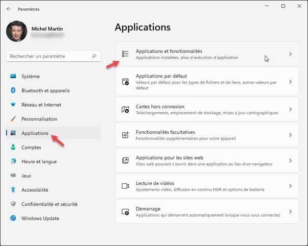 Pour supprimer les applications qui ne vous sont pas utiles, appuyez simultanément sur les touches Windows et I du clavier. La fenêtre des paramètres s’affiche. Cliquez sur Applications dans le volet gauche, puis sur Applications et fonctionnalités dans le volet droit :