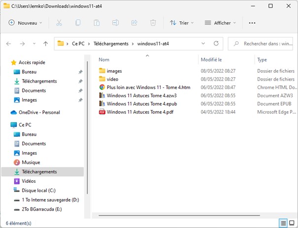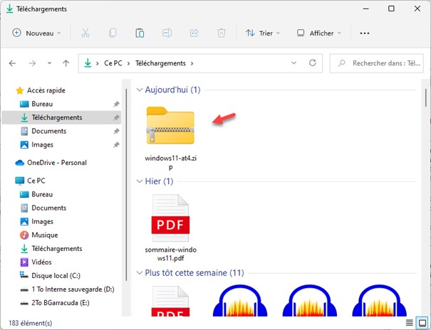 Ouvrez l’Explorateur de fichiers en cliquant sur son icône dans la barre des tâches et ouvrez le dossier qui contient le fichier zippé. Ici, le fichier windows11-at4.zip se trouve dans le dossier Téléchargements :