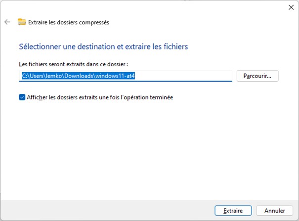 La boîte de dialogue Extraire les dossiers compressés s’affiche. Par défaut, un dossier portant le même nom que le fichier ZIP (sans l’extension) sera créé dans le dossier ou se trouve le fichier compressé :