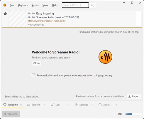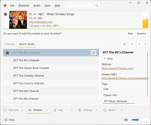 Basculez sur l’onglet Stations pour accéder aux stations radio. Cliquez dans la zone de texte Search et tapez un espace pour afficher une liste de radios. Double-cliquez sur une des stations proposées pour lancer la lecture :