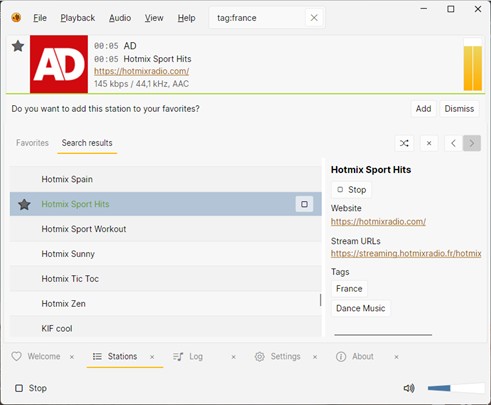Un ou plusieurs tags sont affichés en face de chaque station. Pour réduire la liste des stations à celles qui correspondent à un tag, cliquez sur ce tag. Par exemple, pour avoir les stations françaises, cliquez sur le tag France d’une station :