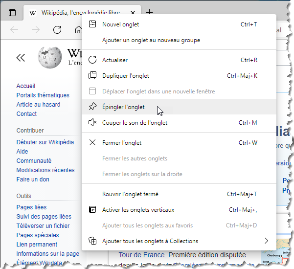 Vous visitez régulièrement un ou plusieurs sites Web ? Microsoft Edge vous permet de les épingler dans la barre d’onglets. Naviguez sur un site, cliquez du bouton droit sur son onglet et choisissez Epingler l’onglet dans le menu contextuel :