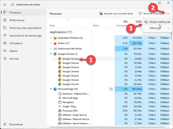 Lorsque vous développez une application en cliquant sur la flèche orientée vers la droite qui la précède, vous constaterez parfois qu’un processus consomme beaucoup (trop) de ressources. Vous pouvez limiter sa consommation pour ne pas pénaliser le système. Cliquez sur le processus concerné(1), sur l’icône En savoir plus (2), puis sur Mode efficacité (3) :