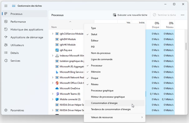 Vous pourriez en particulier être intéressé par la colonne Consommation qui donne la consommation énergétique instantanée de chaque application, et par la colonne Tendance de consommation d’énergie qui donne l’historique de la consommation énergétique de chaque application. Très utile sur un portable !