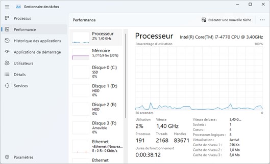 Sous l’onglet Performance sont rassemblées des informations détaillées concernant les processeurs, la mémoire, les unités de masse, le réseau et la ou les cartes graphiques. Cliquez sur l’un de ces éléments pour obtenir une représentation graphique dans le temps et des informations chiffrées complémentaires. À titre d’exemple, si vous cliquez sur Processeur, vous obtenez des informations sur la vitesse du processeur, sur le nombre de processeurs physiques et logiques, sur les mémoires caches, sur la virtualisation, etc..