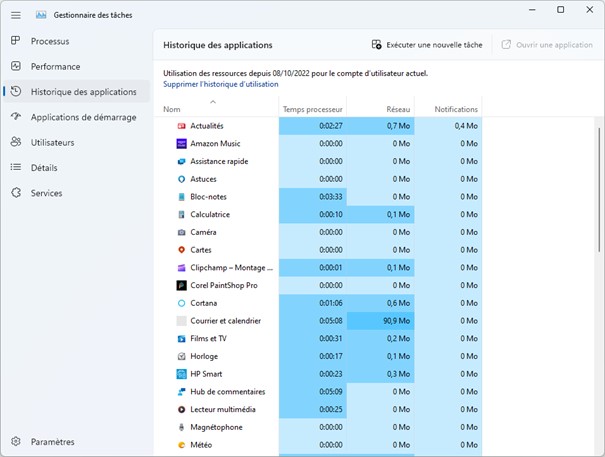 L’onglet Historique des applications donne des informations sur la « consommation » de vos applications en termes de temps processeur et de réseau. Cet onglet est utile si vous voulez savoir d’un simple coup d’œil quelle application sollicite le plus votre ordinateur. Tout comme l’onglet Processus, cet onglet utilise une carte thermique pour vous permettre de repérer rapidement les gros consommateurs.