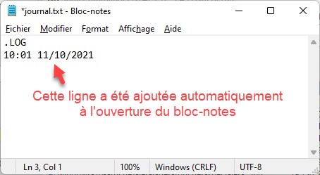 Le bloc-notes peut être utilisé pour définir un journal chronologique. Lancez le bloc-notes. Tapez .LOG sur la première ligne en prenant garde à ne pas oublier le point et à bien écrire LOG en majuscules. Enregistrez ce document. Lorsque vous l’ouvrirez à nouveau, le bloc-notes ajoutera à la fin de celui-ci l’heure et la date courante. Vous pourrez ainsi saisir et conserver simplement des informations horaires :