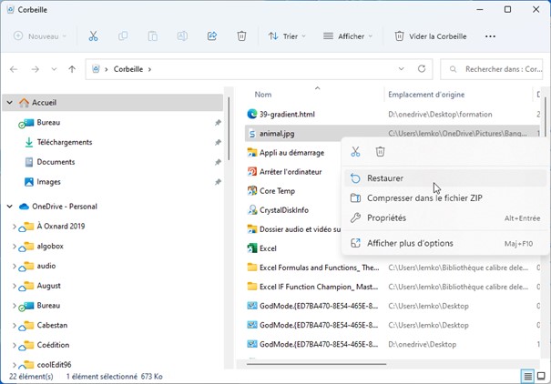 Pour récupérer un fichier qui se trouve dans la corbeille, commencez par double-cliquer sur l’icône Corbeille pour afficher son contenu dans l’explorateur de fichiers. Cliquez du bouton droit sur le fichier que vous voulez récupérer et sélectionnez Restaurer dans le menu. Le fichier est restauré dans le dossier où il se trouvait avant d’être supprimé.