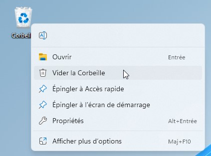 Pour vider la corbeille de tout contenu, cliquez du bouton droit sur l’icône Corbeille et sélectionnez Vider la Corbeille dans le menu. Confirmez la suppression en cliquant sur Oui.