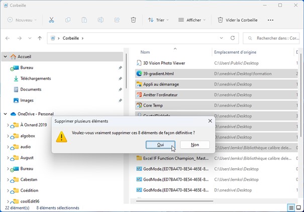Pour vider partiellement la corbeille, ouvrez-la en double-cliquant dessus. Maintenez la touche Contrôle du clavier enfoncée, sélectionnez un à un les éléments à supprimer, puis appuyez sur la touche Suppr du clavier. Confirmez la suppression en cliquant sur Oui.