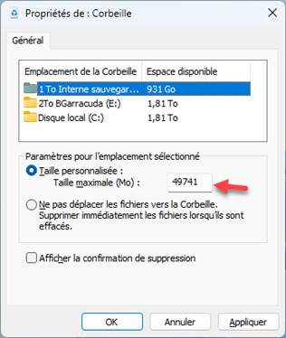 Windows choisit une taille maximale par défaut pour la corbeille. Vous pouvez librement la redéfinir si elle ne vous convient pas. Cliquez du bouton droit sur l’icône Corbeille et sélectionnez Propriétés dans le menu. Pour chacun des disques présents dans votre ordinateur, choisissez une taille en Méga-octets dans la zone de texte Taille maximale de chaque disque et validez en cliquant sur OK.