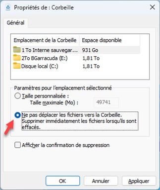 Dans le groupe d’options Paramètres pour l’emplacement sélectionné, une deuxième possibilité vous est offerte. Si vous choisissez l’option Ne pas déplacer les fichiers vers la Corbeille, les fichiers sont supprimés dès que vous appuyez sur la touche Suppr du clavier. La corbeille perd donc tout intérêt. D’un autre côté, le disque dur récupère l’espace disque occupé par les fichiers supprimés dès leur suppression. À vous de peser le pour et le contre de chaque option et de choisir celle qui vous correspond le mieux.