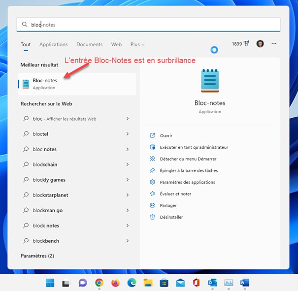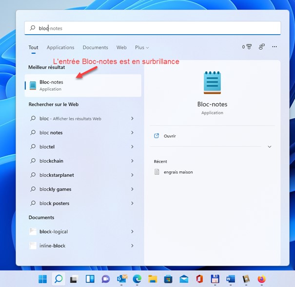Cette zone ne sert quasiment à rien, si ce n’est à vous faire perdre du temps ! Il n’est en effet pas utile de cliquer dessus pour indiquer à Windows ce que vous recherchez. Le simple fait d’avoir déroulé le menu Démarrer vous permet d’indiquer directement ce que vous voulez ouvrir, qu’il s’agisse d’une application ou d’un fichier de données. Par exemple, pour lancer le bloc-notes de Windows 11, appuyez puis relâchez l’une des touches Windows du clavier, puis tapez bloc. L’application Bloc-notes est en surbrillance sous Meilleur résultat. Appuyez sur la touche Entrée du clavier pour la lancer :
