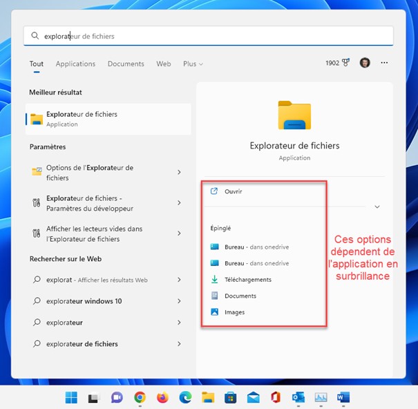 Par exemple, si vous faites une recherche sur le mot explorateur, vous pourrez ouvrir l’explorateur et plusieurs dossiers stratégiques :
