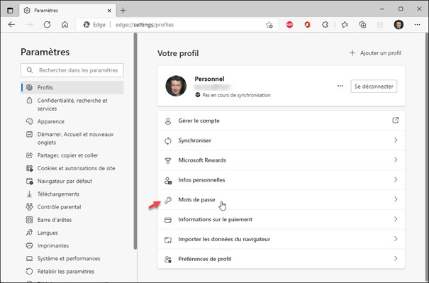 Cliquez sur l’icône Paramètres et plus, dans l’angle supérieur droit de la fenêtre de Microsoft Edge et sélectionnez Paramètres dans le menu. La page edge://settings/profiles s’affiche. Développez la section Mots de passe dans le volet droit :