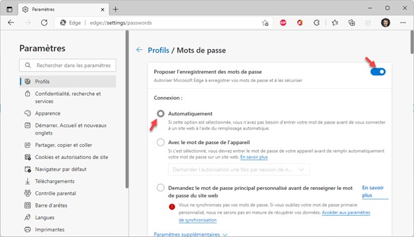 La page edge://settings/passwords s’affiche. Assurez-vous que l’interrupteur Proposer l’enregistrement des mots de passe est en position Activé et que l’option Automatiquement est sélectionnée :