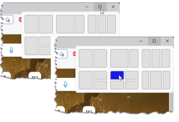 Pour utiliser cette fonctionnalité, pointez l’icône de redimensionnement qui apparaît dans l’angle supérieur droit de l’application et choisissez la taille à donner à l’application en cliquant sur une des mises en page proposées (le nombre de mises en pages dépend de la taille de l’écran) :