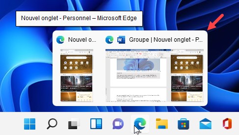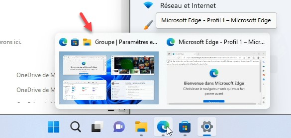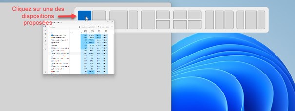 Lorsque des applications ont été ancrées avec une mise en page d’ancrage, vous pouvez facilement les afficher telles qu’elles ont été disposées sur l’écran. Pour cela, pointez l’icône d’une des applications ancrées dans la barre des tâches et cliquez sur la vignette qui représente la mise en page choisie. Ici, la deuxième vignette :