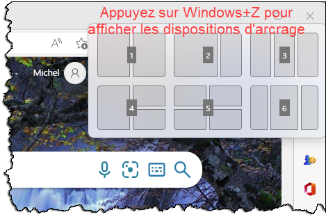 Si vous appréciez les raccourcis clavier, vous pouvez également appuyer sur Windows + Z pour afficher les mises en page d’ancrage dans l’angle supérieur droit de la fenêtre. Appuyez sur le chiffre qui correspond à la disposition souhaitée, puis sur le chiffre qui correspond à l’emplacement de la fenêtre dans la mise en page d’ancrage :