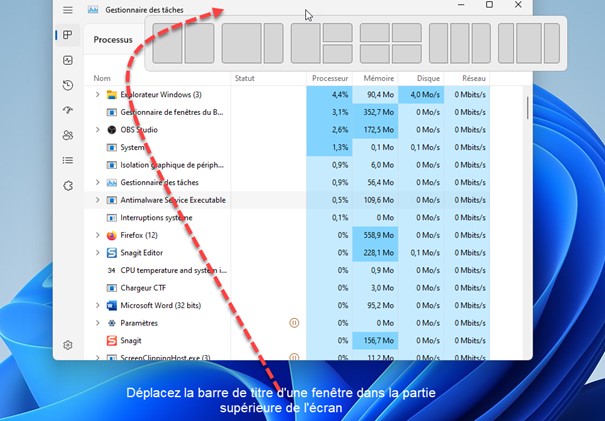 Une autre technique permet d’utiliser les mises en page d’ancrage. Pointez la barre de titre d’une fenêtre, maintenez le bouton gauche de la souris enfoncé et déplacez la fenêtre dans la partie supérieure de l’écran jusqu’à ce que les mises en page d’ancrage apparaissent :