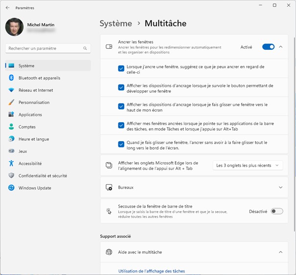 Il est possible de personnaliser le comportement des mises en page d’ancrage. Appuyez simultanément sur les touches Windows et I. La fenêtre des paramètres s’affiche. Cliquez sur Système dans le volet gauche et sur Multitâche dans le volet droit. Développez la section Ancrer les fenêtres en cliquant dessus. Voici comment devrait se présenter l’écran de paramétrage :