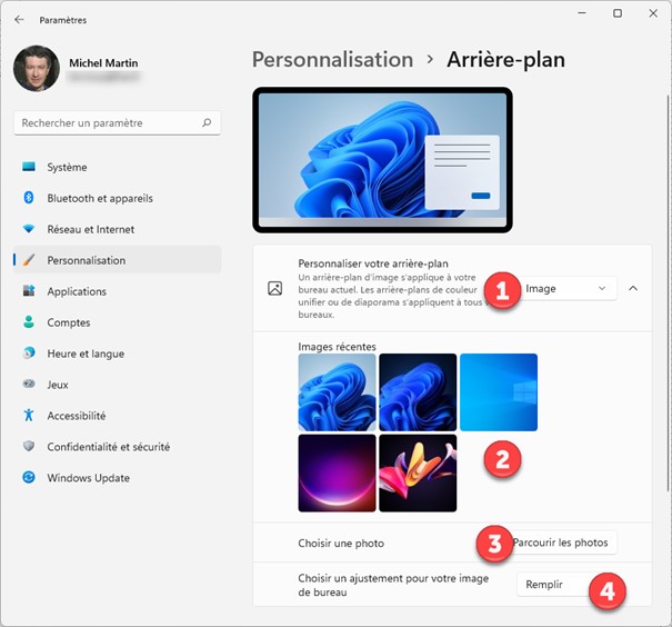 Choisissez Image dans la liste déroulante Personnaliser votre arrière-plan (1). Cliquez sur une des images proposées sous Images récentes (2) ou cliquez sur le bouton Parcourir les photos (3) pour choisir une image dans vos unités de masse :