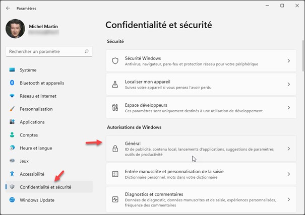 Appuyez simultanément sur les touches Windows et I du clavier. La fenêtre des paramètres s’affiche. Cliquez sur Confidentialité et sécurité dans le volet gauche et sur Général dans le volet droit :