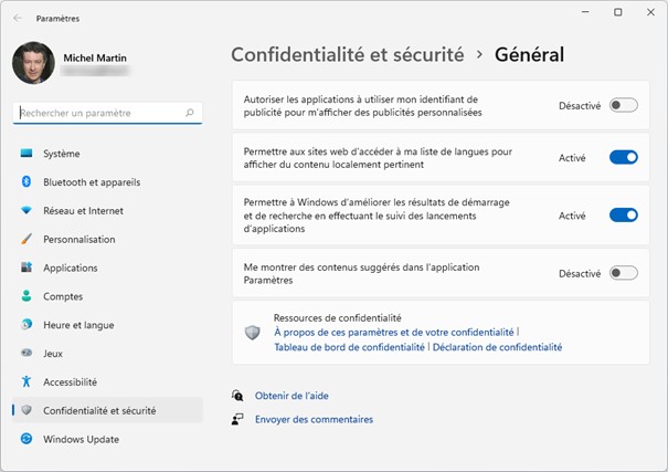 La fenêtre Confidentialité et sécurité/Général s’affiche. Utilisez les interrupteurs pour définir quelles informations peuvent être échangées entre Windows et le monde extérieur :